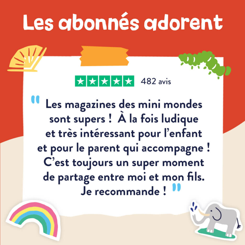 L’abonnement c’est le produit incontournable des Mini Mondes. Votre enfant reçoit tous les mois un nouveau magazine (= une nouvelle destination) dans votre boîte aux lettres. Et vous profitez d’avantages exclusifs (c’est moins cher, vous accédez à des contenus exclusifs et profitez de remises sur tous nos produits) !
